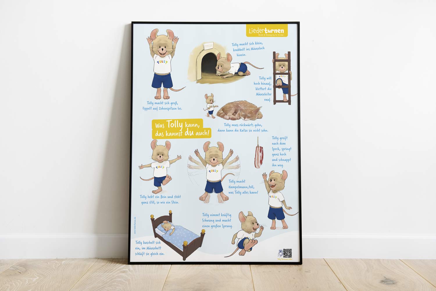 Dieses Plakat illustriert die vier Strophen des Tolly Turnmaus-Liedes. Es eignet sich zum Kennenlernen von Tolly Turnmaus und zur Vorstellung der Tolly-Bewegungen bei der Liedeinführung.