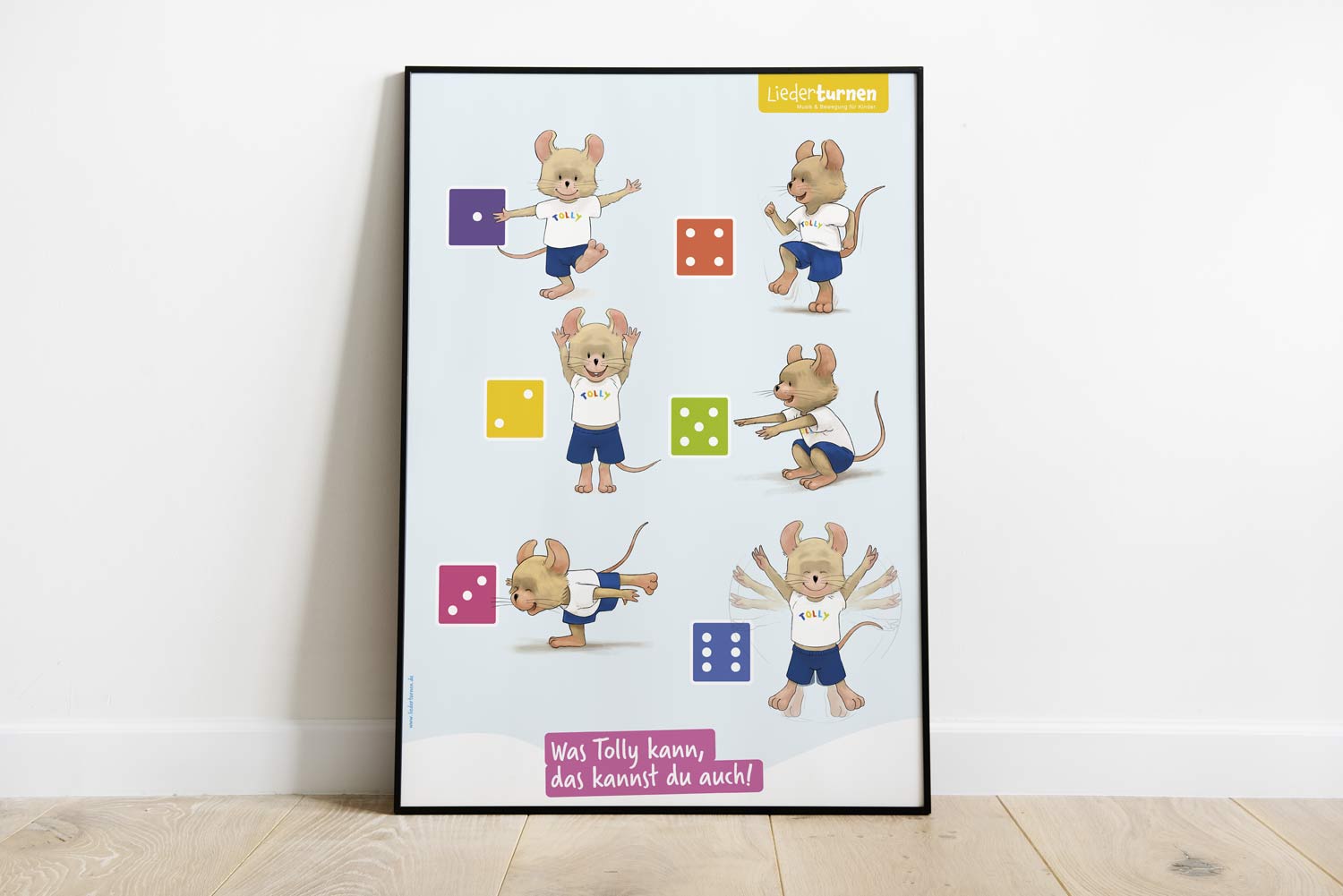 Auf diesem Plakat finden sich Abbildungen, die einige Szenen aus Liedern der Liederturnen-CD und der Postkarten-Abenteuer von Tolly Turnmaus darstellen. Sie regen die Fantasie der Kinder an, ermuntern sie zum Sprechen und eignen sich zur Einführung und Reflexion der Lieder und Postkarten-Abenteuer.