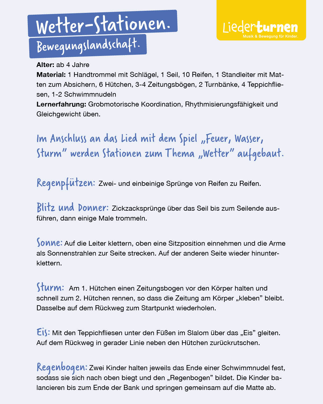 Im Anschluss an das Lied mit dem Spiel „Feuer, Wasser, Sturm” werden Stationen zum Thema „Wetter” aufgebaut.
