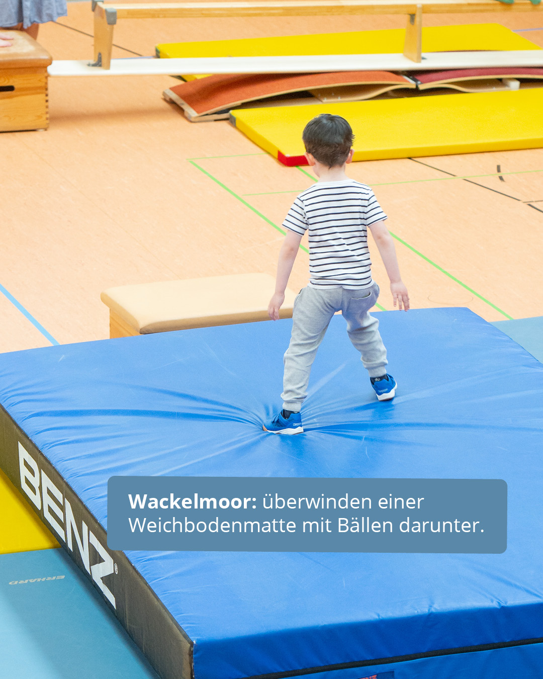 - Wackelmoor: überwinden einer Weichbodenmatte mit Bällen darunter.