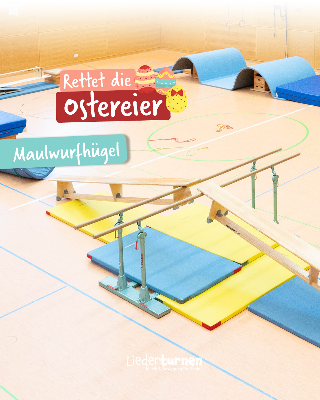 - Über den Maulwurfhügel (Über zwei Bänke krabbeln, die am Barren auf- und absteigend eingehängt sind, dabei den kleinen Graben überwinden.)