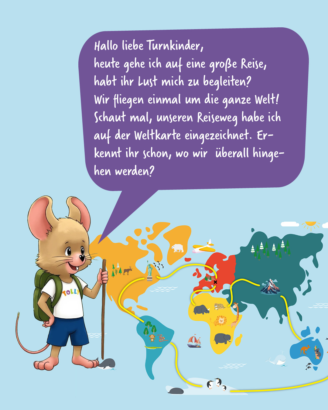 Tolly lädt die Kinder ein, mit ihr auf Weltreise zu gehen.
