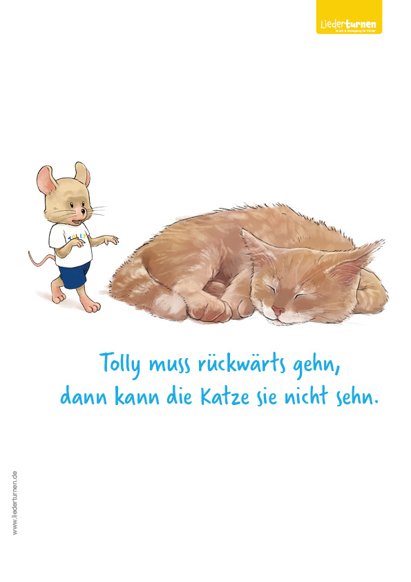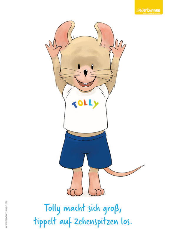 Dieses Plakat illustriert die vier Strophen des Tolly Turnmaus-Liedes. Es eignet sich zum Kennenlernen von Tolly Turnmaus und zur Vorstellung der Tolly-Bewegungen bei der Liedeinführung.