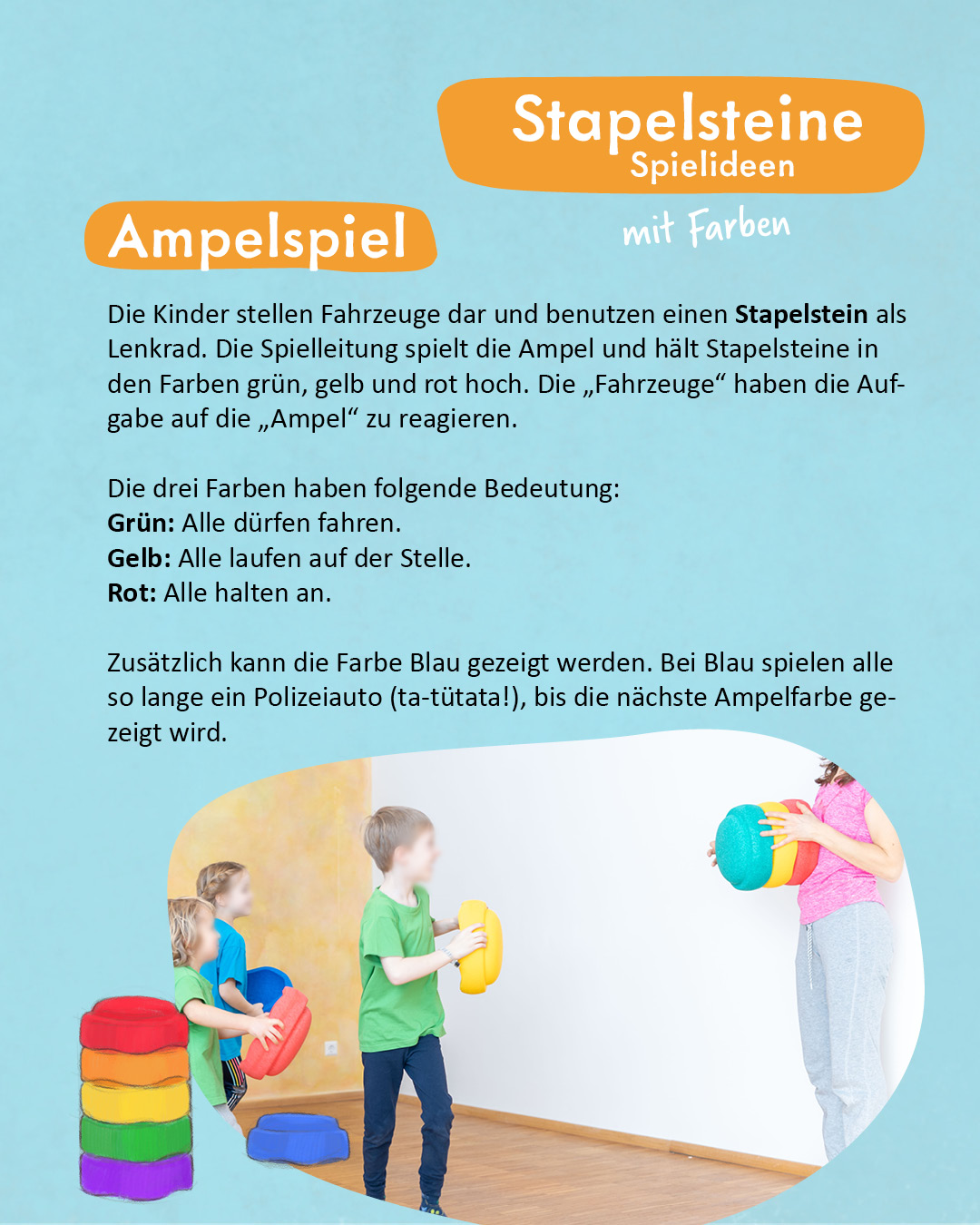 Die Kinder stellen Fahrzeuge dar und benutzen einen Stapelstein als Lenkrad. Die Spielleitung spielt die Ampel und hält Stapelsteine in den Farben grün, gelb und rot hoch. Die „Fahrzeuge“ haben die Aufgabe auf die „Ampel“ zu reagieren.
