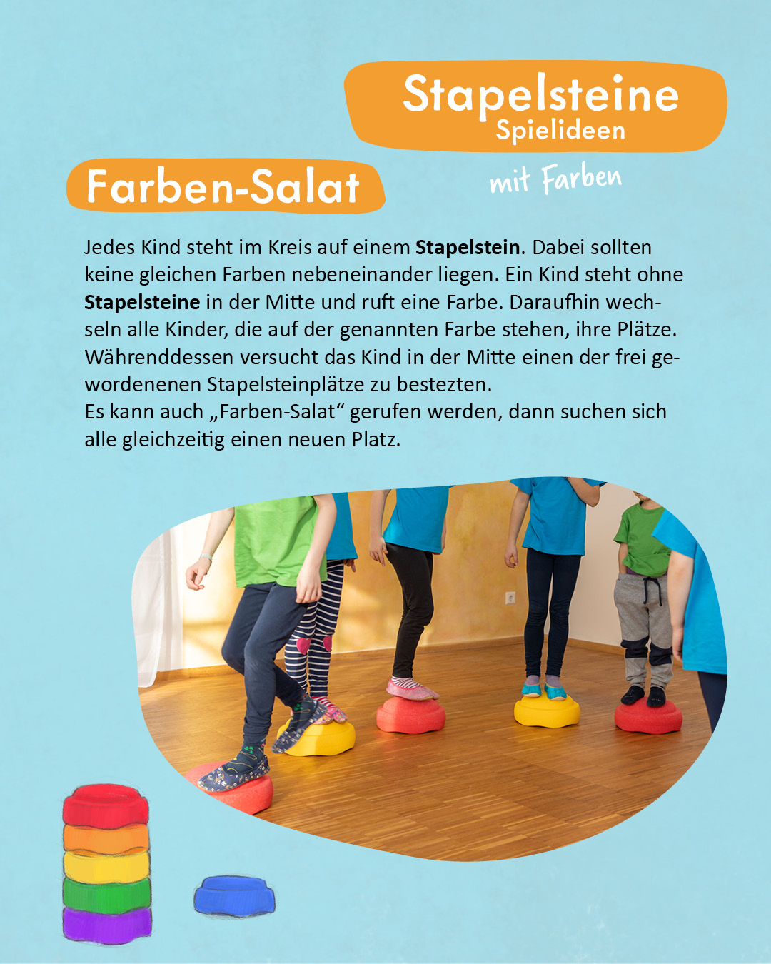 Jedes Kind steht im Kreis auf einem Stapelstein. Dabei sollten keine gleichen Farben nebeneinander liegen. Ein Kind steht ohne Stapelsteine in der Mitte und ruft eine Farbe. Daraufhin wechseln alle Kinder, die auf der genannten Farbe stehen, ihre Plätze. Währenddessen versucht das Kind in der Mitte einen der frei gewordenenen Stapelsteinplätze zu bestezten.