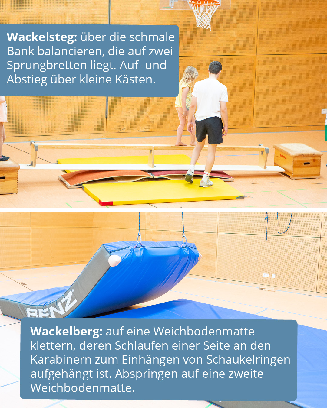 - Wackelsteg: über die schmale Bank balancieren, die auf zwei Sprungbretten liegt. Auf- und Abstieg über kleine Kästen.