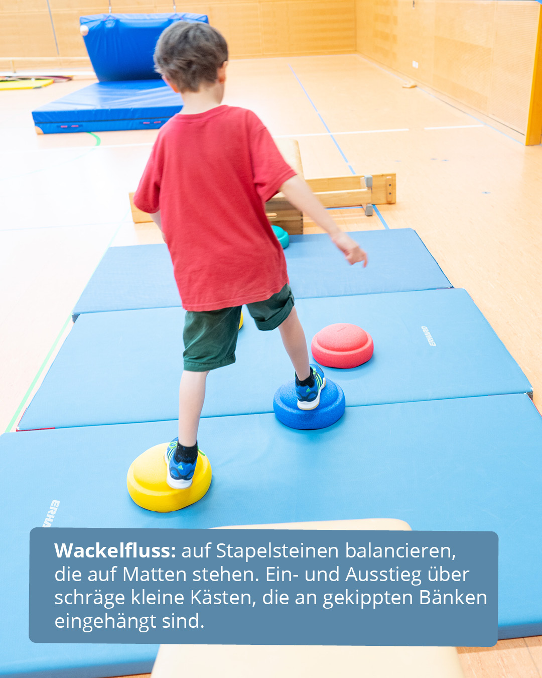 - Wackelfluss: auf Stapelsteinen balancieren, die auf Matten stehen. Ein- und Ausstieg über schräge kleine Kästen, die an gekippten Bänken eingehängt sind.