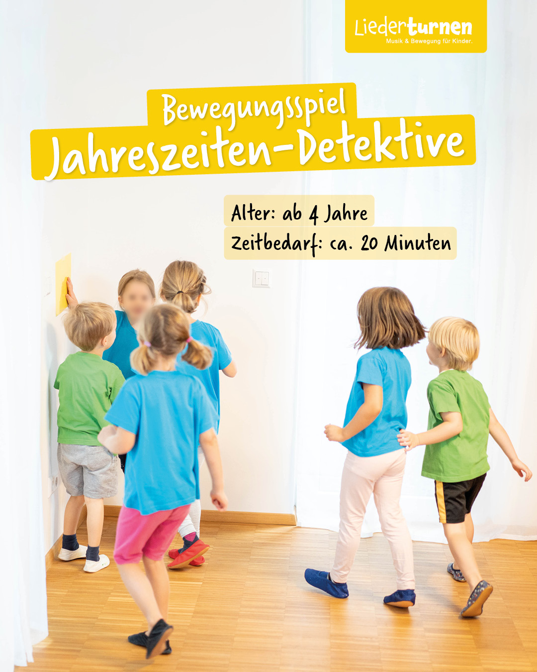 Die Fachkraft zeigt den Kindern nacheinander die Bilder der vier Jahreszeiten. Die Kinder benennen die jeweils abgebildete Jahreszeit und erzählen, was sie auf dem Bild sehen. Dann werden die Bilder an den vier Raumwänden aufgehängt. Zur Musik bewegen sich die Kinder durch den ganzen Raum. Nach einiger Zeit stoppt die Fachkraft die Musik und ruft eine Jahreszeit. Jetzt gilt es, schnell zu dem passenden Bild zu laufen. Dies wird mehrmals wiederholt.