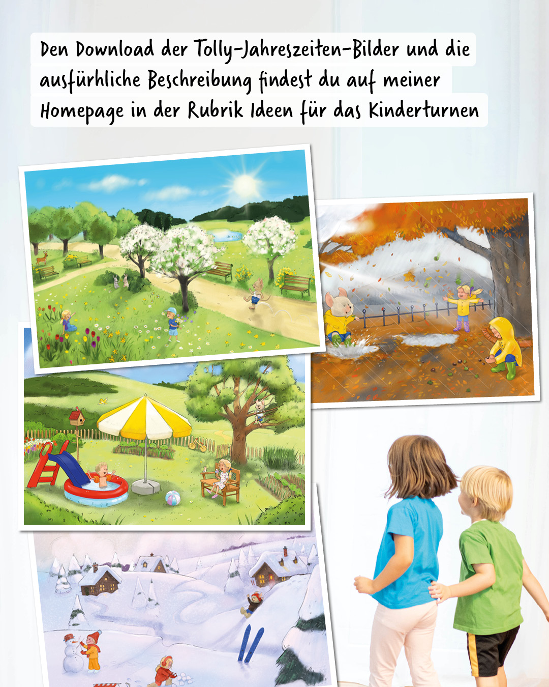 Material: Tolly-Jahreszeiten-Bilder (Vorlage im Download), Klebestreifen und das Lied „Wir turnen durch das Jahr”