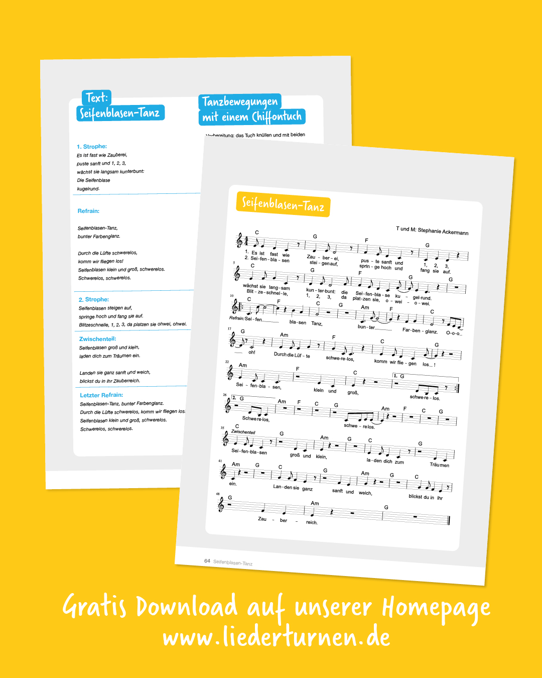 Der Tanz kann mit Chiffon-Tüchern oder auch mit Reifen als Seifenblasen umgesetzt werden und ebenso ist natürlich auch das Tanzen ganz ohne Material möglich. Das Lied soll mit seiner Melodie und seinem Text in erster Linie dazu einladen tänzerisch kreativ zu werden. Daraus kann sich eine Abfolge entwickeln, die sich bei Lust und Laune auch als kleine Aufführung vor Publikum darbieten lässt. Nutze das Lied auch, um draußen im Garten echte Seifenblase fliegen zu lassen. Die Kinder haben großen Spaß daran ihnen nachzulaufen und nach ihnen zu greifen. Lass sie auch selbst pusten, das trainiert ihre Atmung und Mundmotorik.