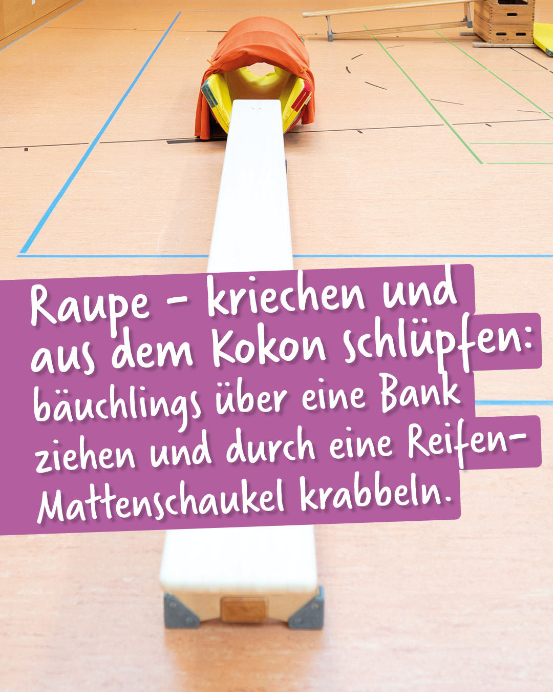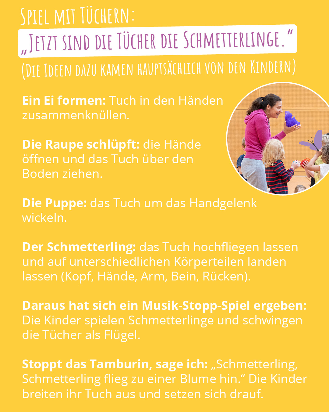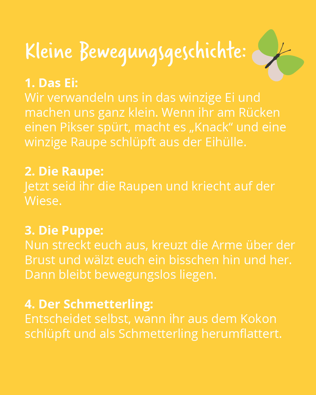 Wir verwandeln uns in das winzige Ei und machen uns ganz klein. Wenn ihr am Rücken einen Pikser spürt, macht es „Knack“ und eine winzige Raupe schlüpft aus der Eihülle.