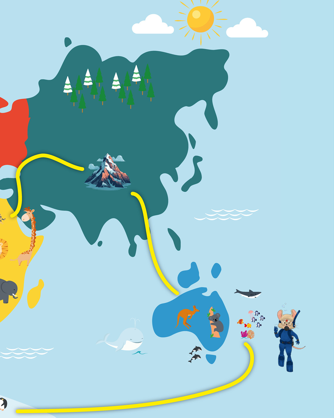 Gemeinsam klettern sie in New York auf die Freiheitsstatue. In Südamerika schwingen sie wie Affen an Lianen durch den Regenwald. In Südamerika begrüßen sie die Pinguine, gehen durch eine Gletscherspalte und angeln am Eisloch. In Australien tauchen sie ab in die Schönheit und Tiefen des Great Barrier Reef. In Asien besteigen sie den Mount Everest und in Afrika gehen sie auf Foto-Safari.